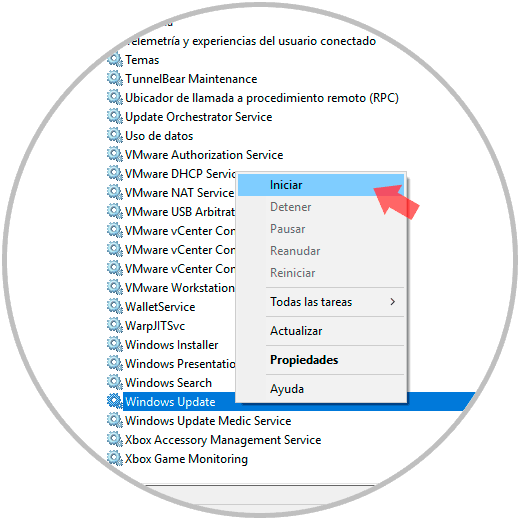 Allí damos clic derecho sobre el servicio llamado “Windows Update” y seleccionamos la opción “Iniciar”: