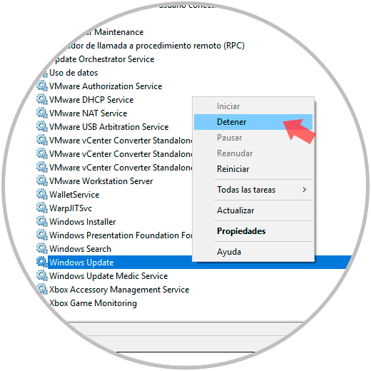 Pulsamos en Aceptar o las teclas Enter y en la nueva ventana desplegada, ubicamos el servicio llamado “Windows Update”, damos clic derecho sobre él y seleccionamos la opción “Detener”: