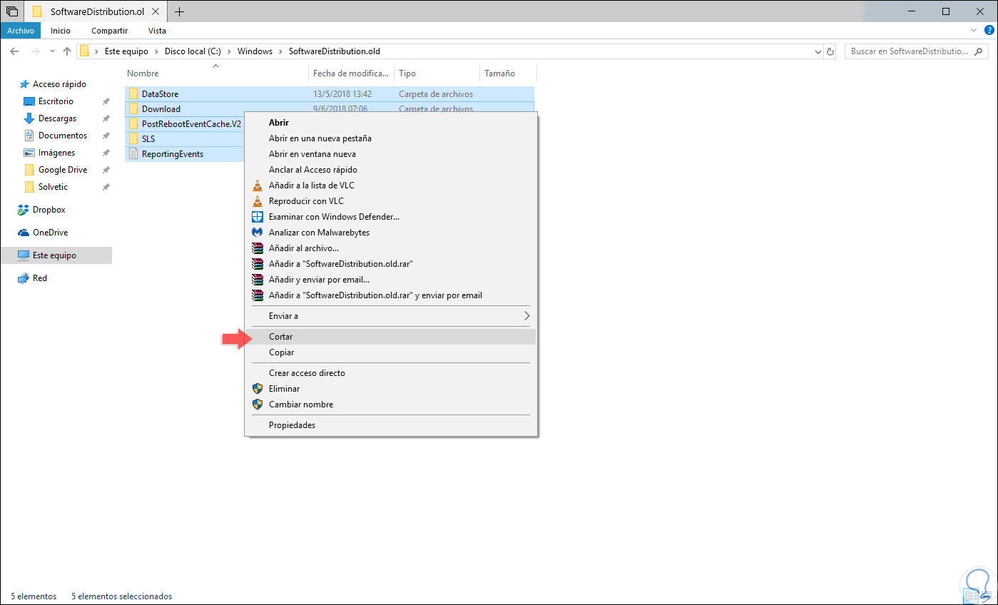 Luego de esto, procedemos a cortar el contenido de la carpeta “SotwareDistribution.old” y lo pegaremos en la carpeta que hemos creado en la unidad D, para ello seleccionamos este contenido, damos clic derecho y seleccionamos Cortar: