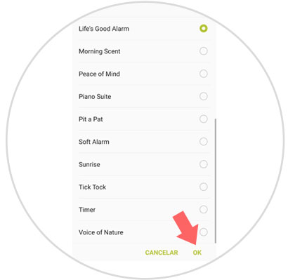 Por último, en el listado busca la melodía que quieres seleccionar como tono de alarma en tu terminal y cuando te hayas decidido por una de ellas selecciónala, (quedará señalada con un punto verde a la derecha) y pulsa OK situado en la esquina inferior derecha de la pantalla. Ya estará listo.