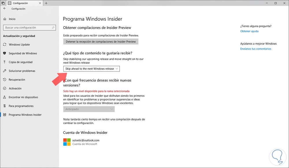 Otro punto a tener en cuenta, es que para recibir esta nueva actualización de Windows 10, debemos asociar la cuenta al programa Insider y seleccionar la opción Skip ahead to the next Windows release en la sección ¿Qué tipo de contenido le gustaría recibir?