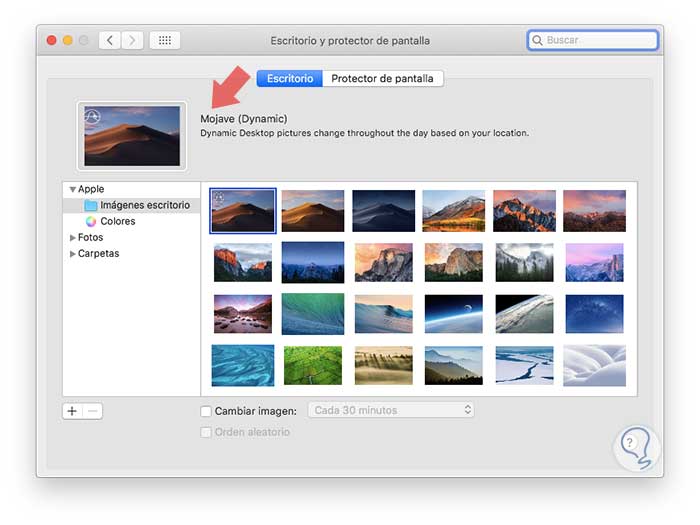En caso de no ser así pulsamos en el icono de candado ubicado en la parte inferior e ingresaremos nuestra contraseña para realizar el proceso de activación. Para activar el escritorio dinámico seleccionamos la opción Escritorio y protector de pantalla en Preferencias del sistema y será desplegado lo siguiente. Allí seleccionamos la primera imagen disponible, ubicada en la pestaña Escritorio, la cual es la imagen dinámica de macOS Mojave para que de forma automática se realice la respectiva transición durante el día.