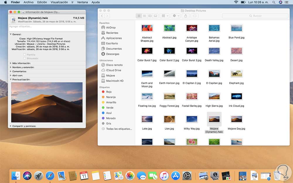 Todos los demás fondos de pantalla disponibles en macOS Mojave estarán en formato JPG y esta imagen en especial como archivo de fondo de pantalla dinámico HEIC de Mojave incluye un total de 16 capas con lo cual se logra la transición del escritorio dinámico, la razón, simple, el escritorio dinámico va cambiando o modificando su nivel de brillo a medida que el día va pasando.