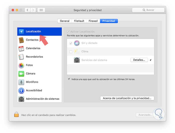 Allí seleccionamos la categoría Seguridad y privacidad y en la nueva ventana vamos a la pestaña Privacidad donde validamos que la casilla Activar localización se encuentre activa: