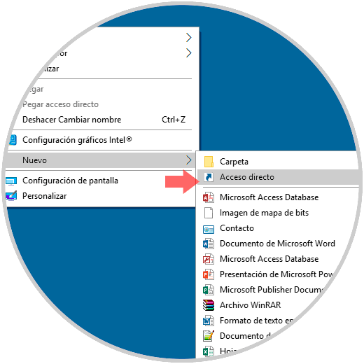 Para esto, daremos clic derecho en cualquier área libre del escritorio y allí seleccionamos la opción “Nuevo /Acceso directo”: