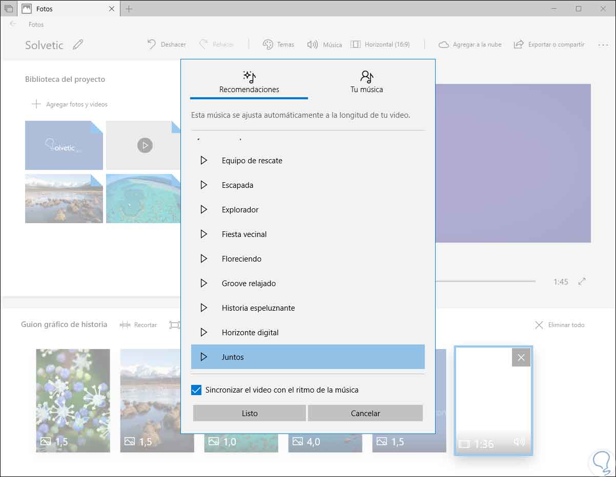 Para agregar música a un vídeo especifico, debemos dar clic en el botón “Música” en la parte superior. La aplicación Fotos incluye algunas opciones de música propia para seleccionar, pero lógicamente también podemos seleccionar la pestaña “Tu música” para insertar un archivo de música de nuestra biblioteca: