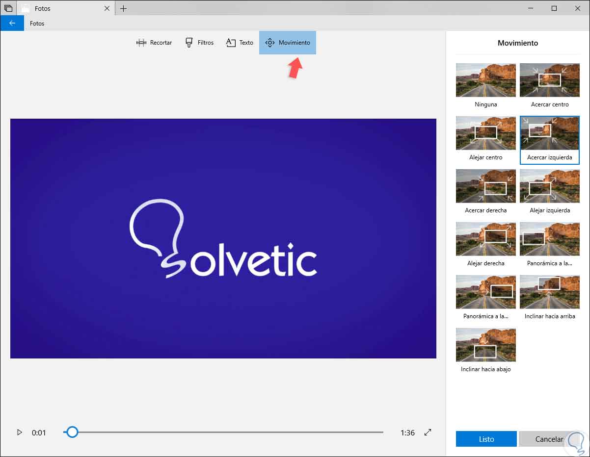 Con la herramienta Movimiento podremos seleccionar diferentes estilos de movimiento de la cámara para el vídeo o la foto seleccionada y añadir así aún más efectos a esta: