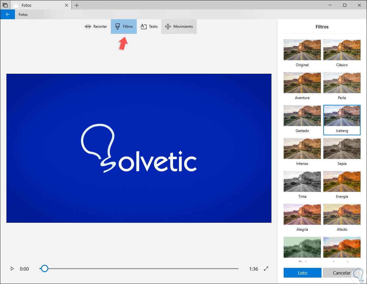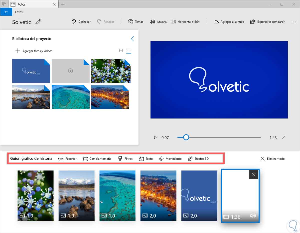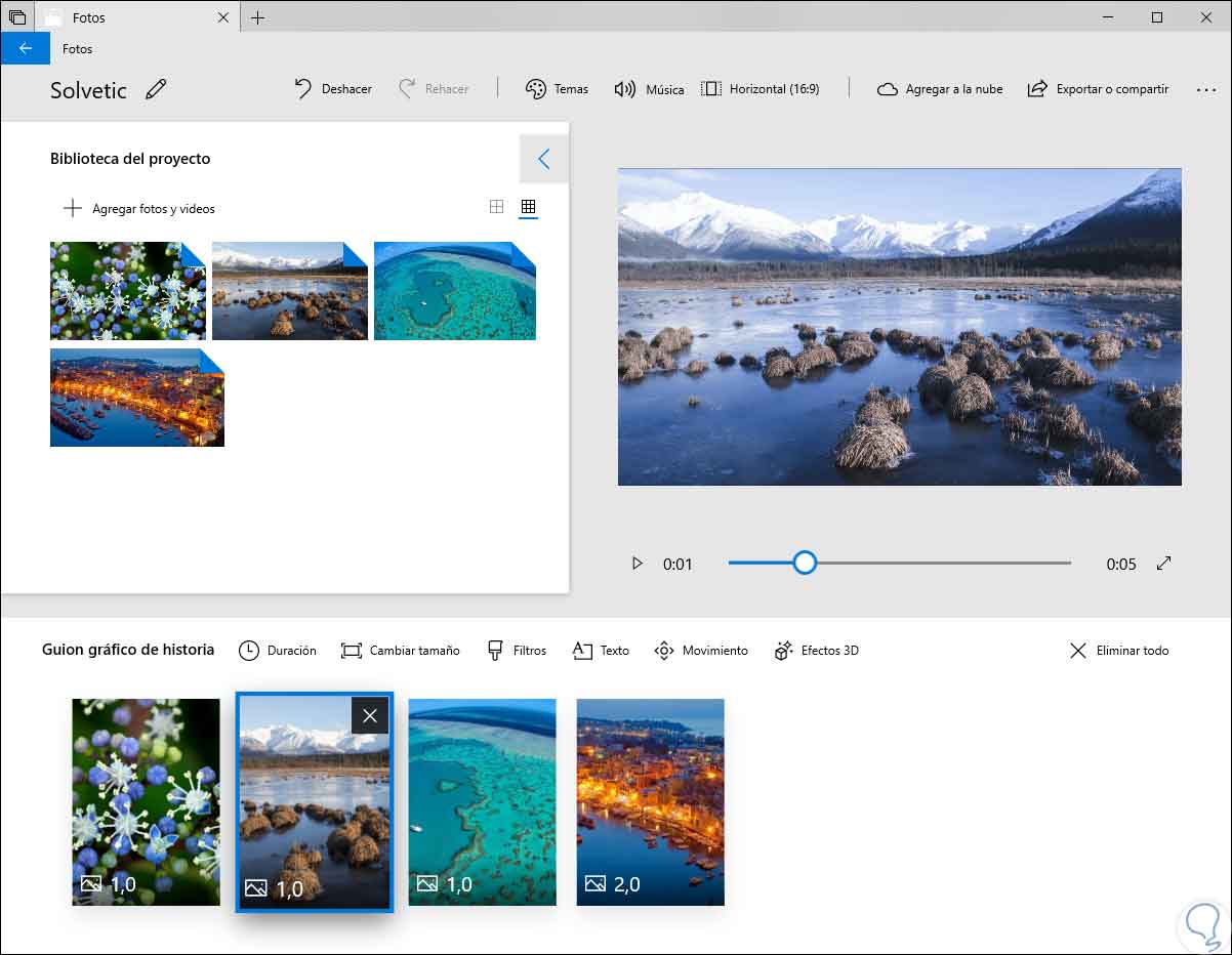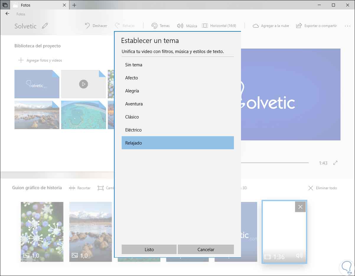 Fotos cuenta con una opción llamada Temas ubicada en la parte superior de la ventana y gracias a ella será posible elegir diferentes temas, estos contienen filtros, música y estilos de texto que funcionan en conjunto y pueden ser completadas con vídeos de vista previa que despliegan como será su aspecto final: