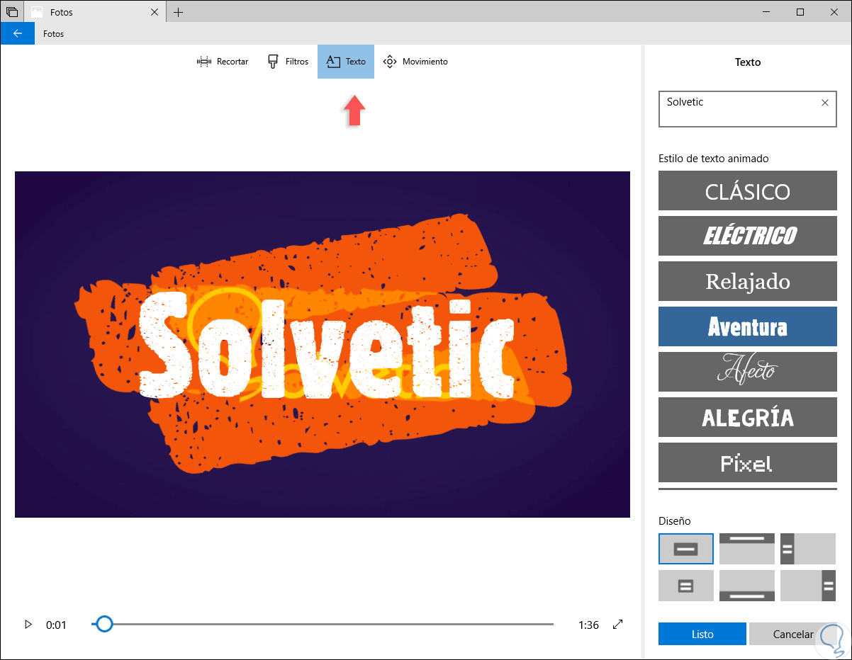 La herramienta Texto nos otorga diferentes estilos y diseños de texto animado los cuales pueden ser usados en diferentes ubicaciones del vídeo seleccionado: