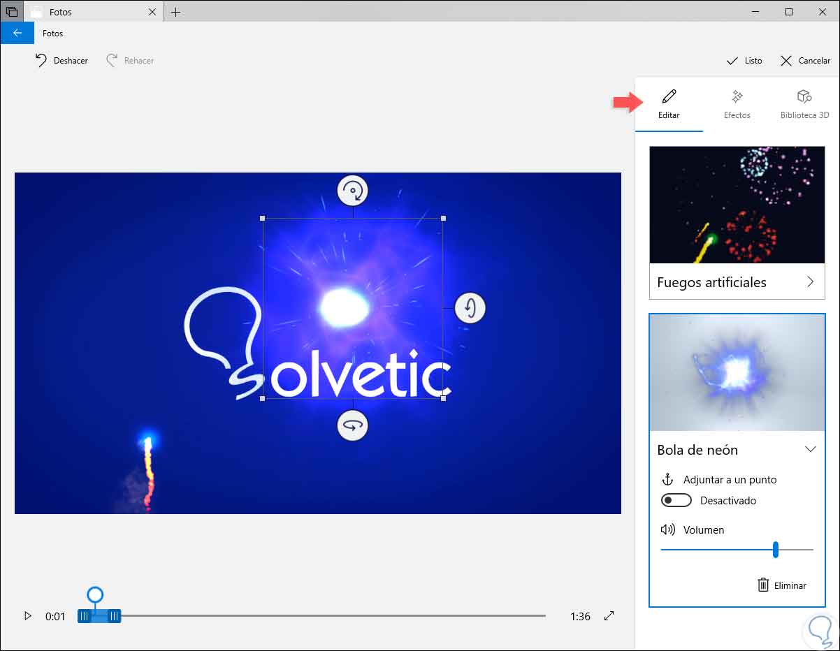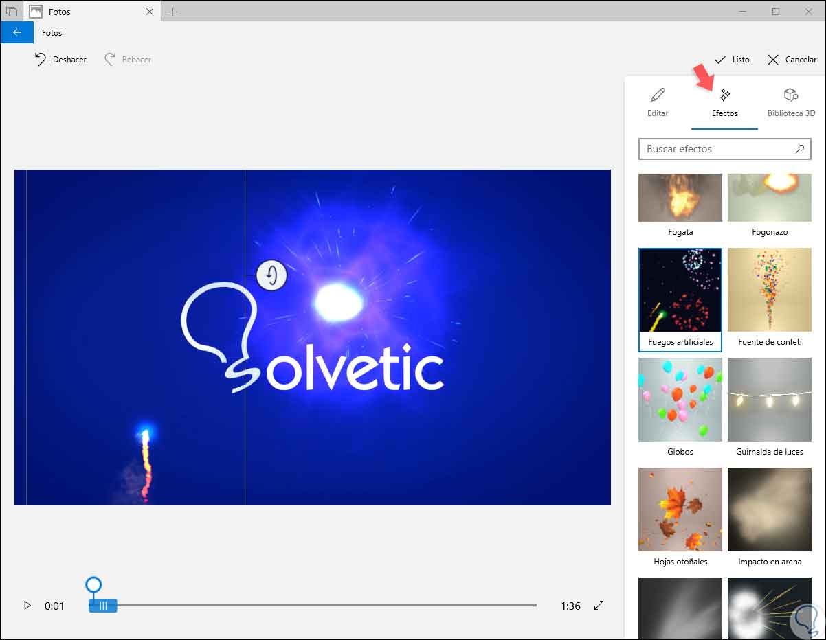 Todo esto lo encontramos en la sección “Filtros”, otra de las acciones útiles de este editor integrado es la opción de usar Efectos 3D los cuales sin duda agregan aún más dinamismo a nuestros vídeos ya que esta una biblioteca de efectos 3D cuenta con efectos como bolas neón, burbujas, cascadas, chispas eléctricas y muchos más.
