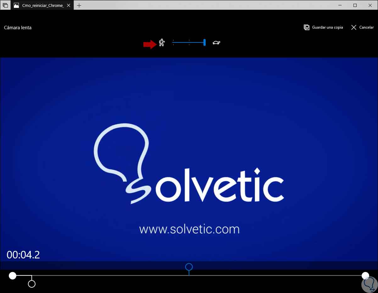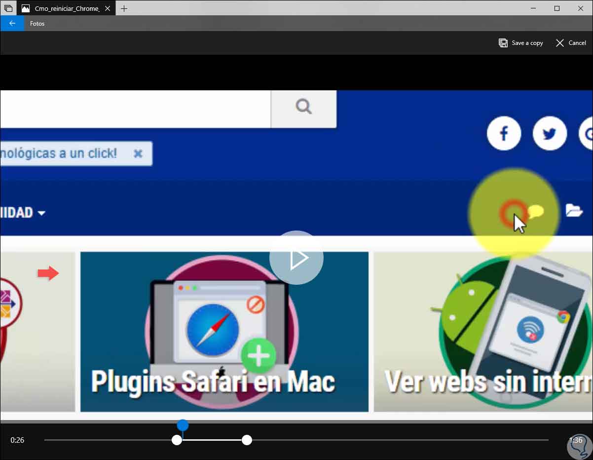 Una vez definidos estos límites del vídeo, podemos dar clic en la opción “Save a copy” ubicada en la parte superior derecha para guardar una copia de la sección recortada del vídeo, si no deseamos guardar los cambios daremos clic en “Cancel”.