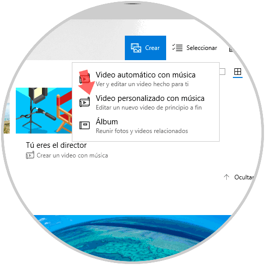Pulsamos en el botón “Crear vídeo” y es necesario que adicionemos al menos un vídeo o una foto para crear un vídeo personalizado.