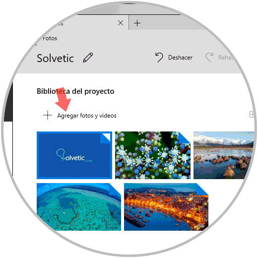 Para añadir uno o más vídeos, o fotos, al proyecto activo, podemos arrástrelos desde la biblioteca del proyecto al guion gráfico o dar clic en la opción “Agregar fotos y vídeos” en la biblioteca del proyecto para agregar más vídeos a la biblioteca y luego arrastrarlos al guion gráfico:
