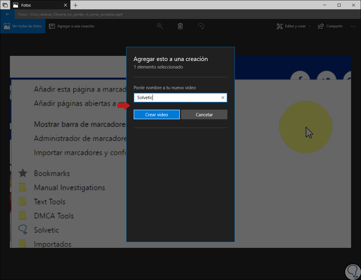 Al momento de seleccionar la opción para crear el vídeo debemos asignar un nombre: