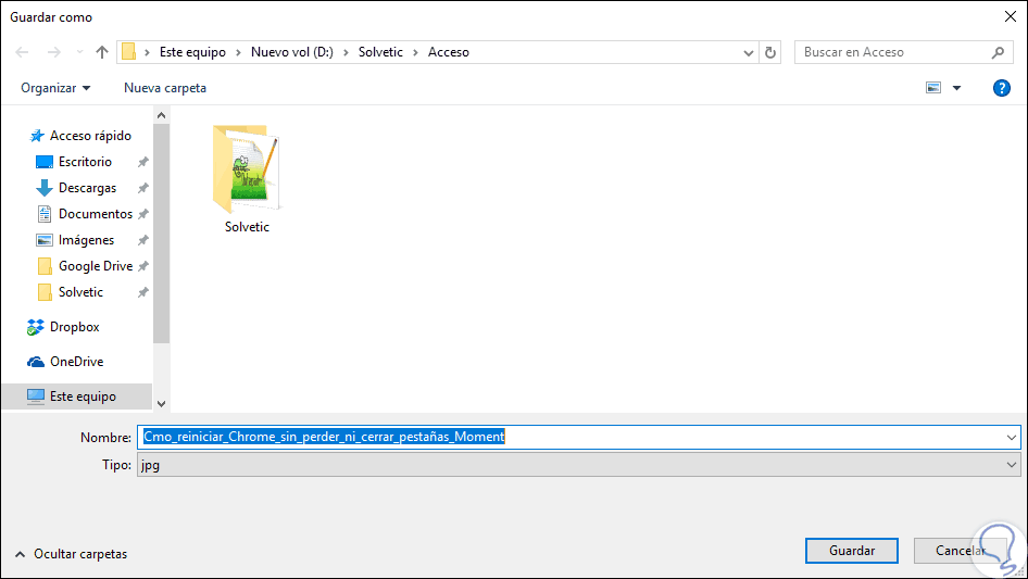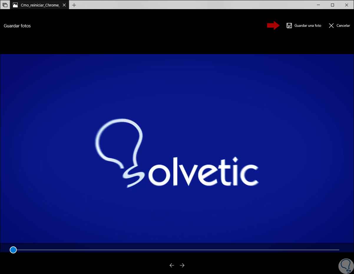 En la parte inferior de la ventana podemos ver los botones "Marco anterior" y "Marco siguiente" los cuales nos permiten seleccionar un cuadro específico del archivo de vídeo y una vez definido pulsamos en el botón “Guardar una foto” ubicado en la parte superior. Al pulsar allí veremos que dicha foto será guardada con la extensión .jpg: