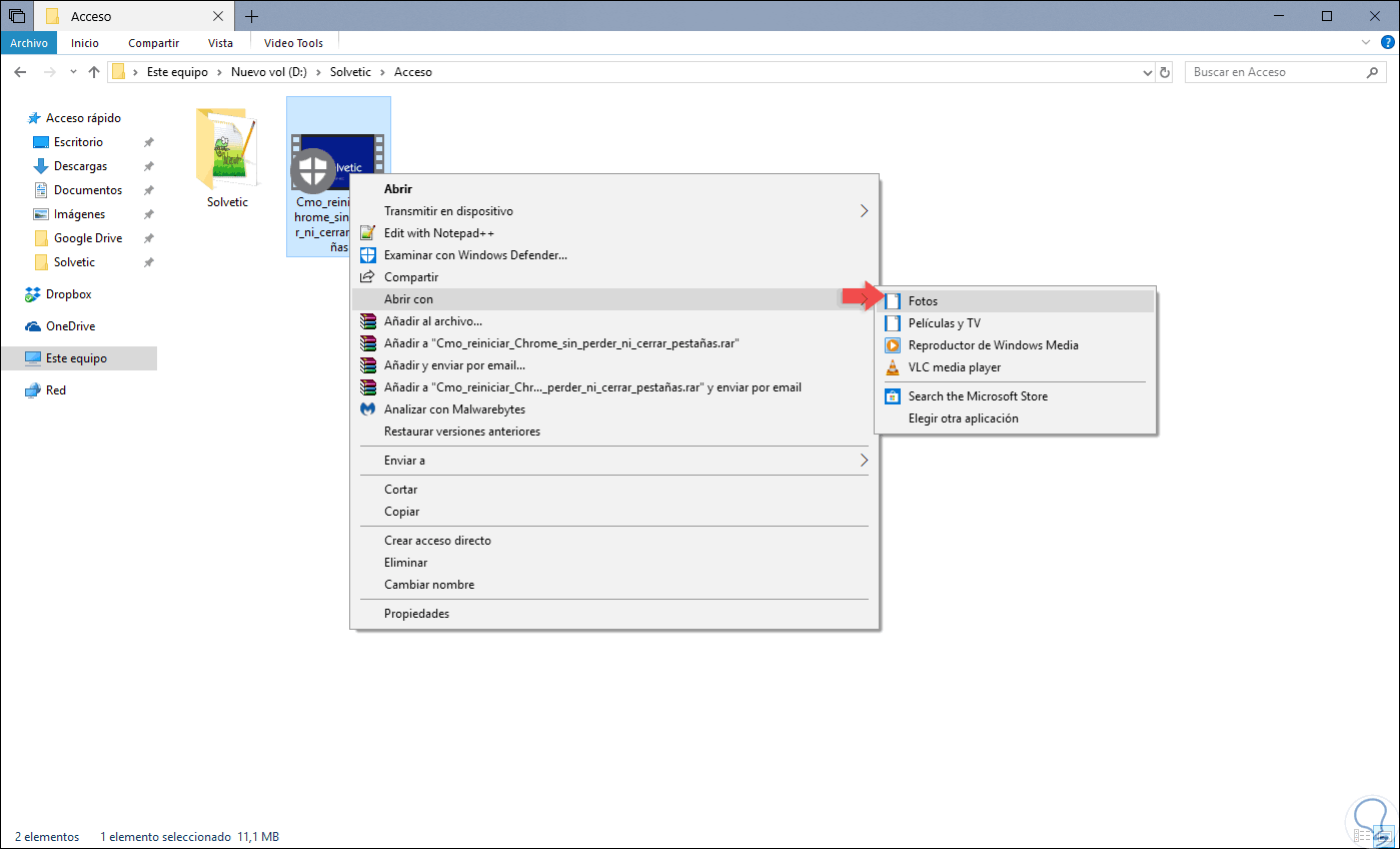 Para llevar a cabo estas acciones tradicionales en un vídeo, este debe ser abierto con la aplicación Fotos, para ello, seleccionamos el vídeo, damos clic derecho sobre él y seleccionamos la opción “Abrir con” y seleccionamos la opción “Fotos”: