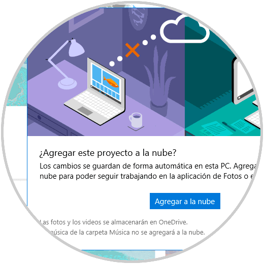 También podemos dar clic en el botón “Agregar a la nube” si deseamos subir el vídeo a la nube de Microsoft., esto nos permite reanudar la edición en la aplicación Fotos en otro equipo donde se haya iniciado sesión con la misma cuenta de Microsoft.