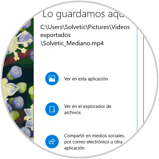La aplicación Fotos exporta el vídeo y nos indica dónde está guardado de forma local: