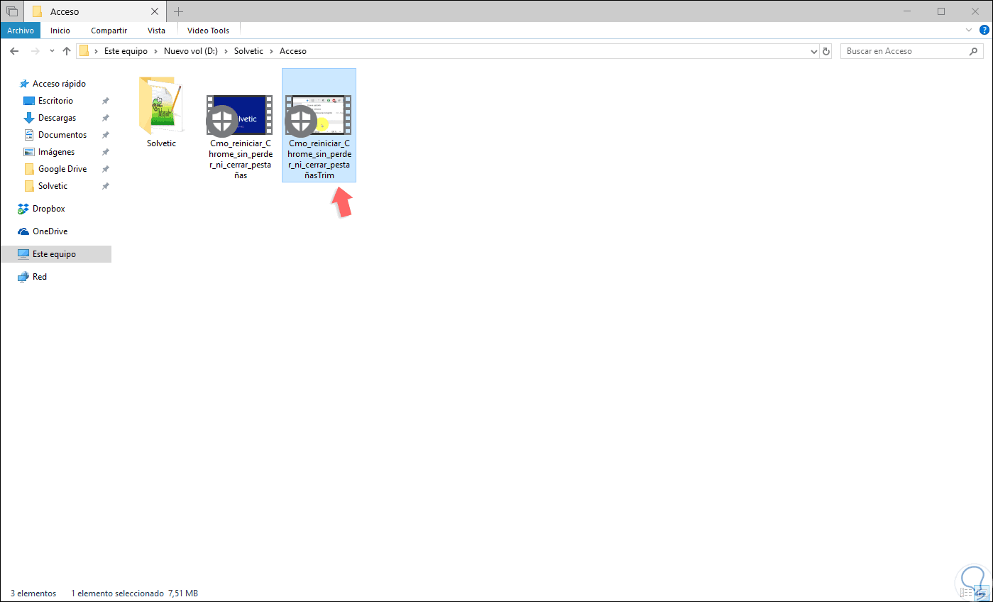 Cuando se han aplicado los cambios, la aplicación Fotos no afecta directamente el vídeo original, en su lugar almacena una copia, en el caso de la opción Recortar, con la terminación “Trim”: