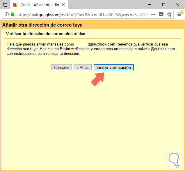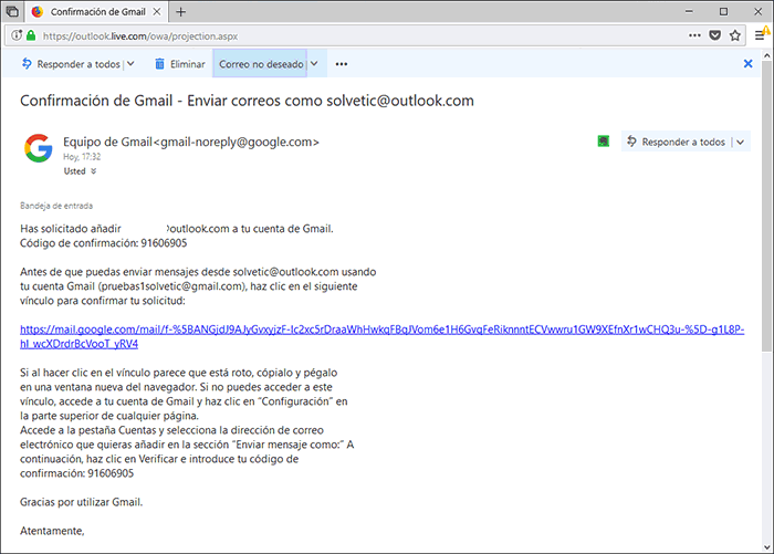 Allí pulsamos en el botón Enviar verificación y en nuestra cuenta a asociar veremos un mensaje similar a este: