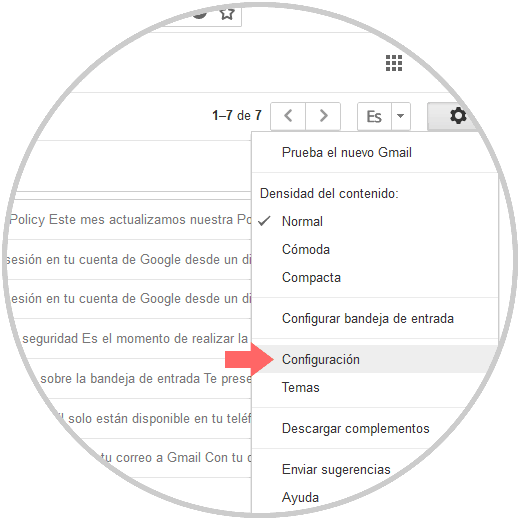 Para iniciar el proceso debemos acceder a nuestra cuenta de Gmail y allí pulsar en el icono de engranaje ubicado bajo nuestro usuario y allí seleccionamos la opción Configuración: