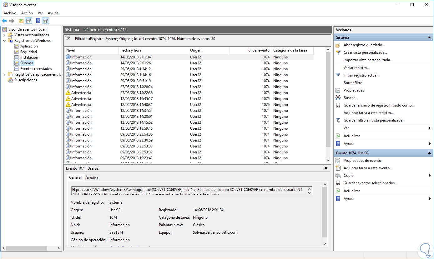 El ID 1074 indica que el apagado o reinicio de Windows Server 2016 o 2019 ha sido controlado y conocido, estos son de origen USER32. El ID 1076 indica eventos que han sucedido de forma inesperada en el servidor. En la ventana del visor de eventos podremos especificar un rango de fechas o especificar un usuario o equipo determinado. Pulsamos en el botón “Aceptar” y este será el resultado obtenido: