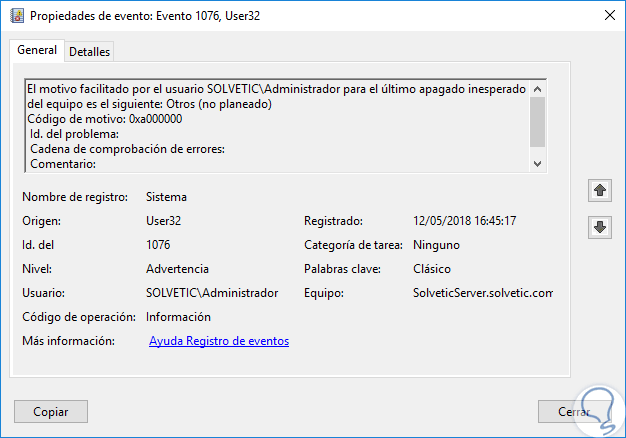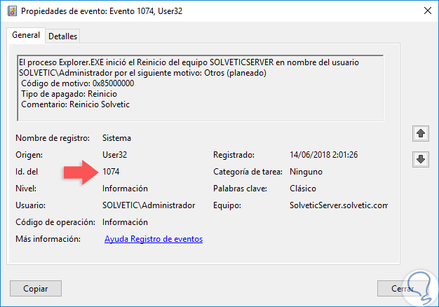Allí tenemos cada uno de los eventos filtrados según nuestra solicitud. Al dar doble clic sobre alguno de los eventos accedemos a información mucho más completa sobre este. En el caso de los ID 1074, como el que hemos reiniciado con un comentario, veremos lo siguiente: