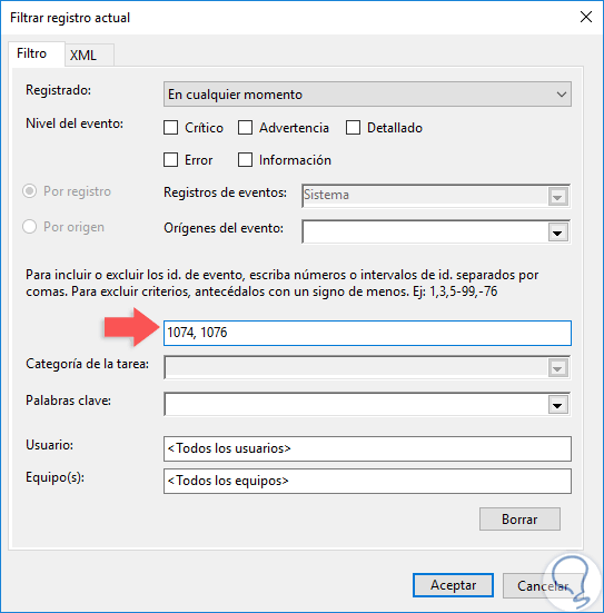 Será desplegada la siguiente ventana donde ingresaremos los siguientes IDs de evento en el campo respectivo: