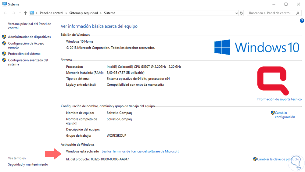 1. Saber si Windows 10 está activado desde Propiedades de Equipo