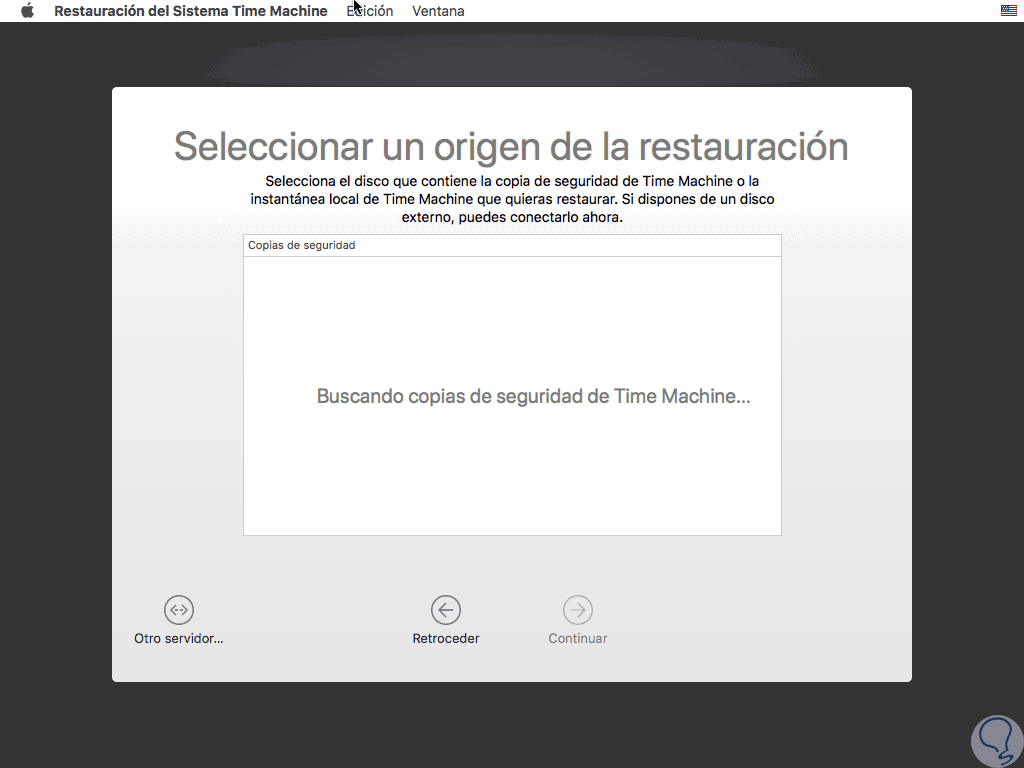 Pulsamos en “Continuar” e iniciará el proceso de búsqueda de las copias de seguridad de Time Machine disponibles: