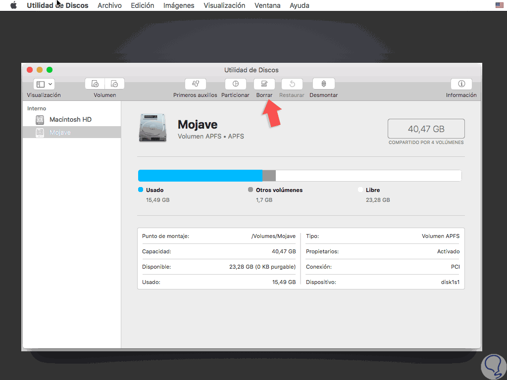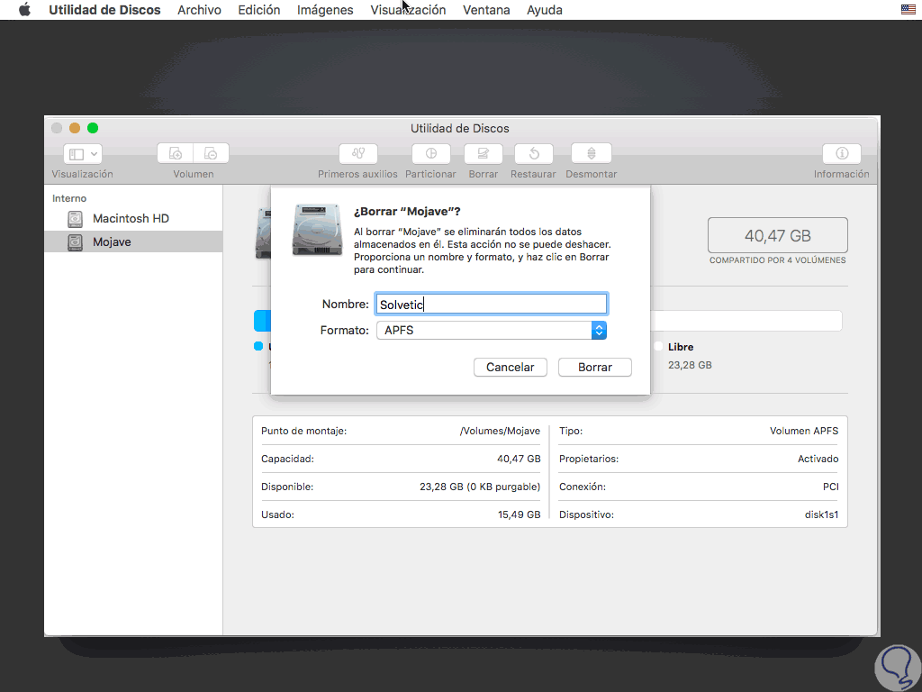 Allí seleccionamos el disco duro donde se encuentra instalado macOS Mojave y pulsamos en el botón “Borrar” ubicado en la parte superior. Se desplegará la siguiente ventana donde definimos: