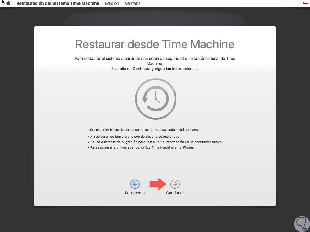 Desde la pantalla "Seleccionar una copia de seguridad" de Time Machine, debemos seleccione la copia de seguridad más reciente que se encuentre disponible asociada a la versión de macOS que deseamos revertir en la versión anterior, recordemos que High Sierra es 10.13, Sierra es 10.12, El Capitán es 10.11y una vez definido esto seleccionamos Continuar. Definimos la unidad de destino para restaurar esa copia de seguridad de Time Machine, la cual es la que hemos formateado y daremos clic en "Restaurar" para restaurar la copia de seguridad en esa unidad específica.