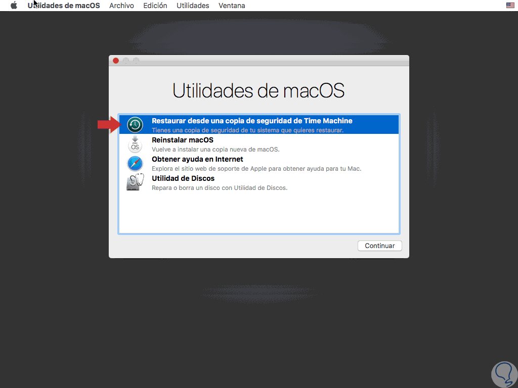 Ahora, en la nueva ventana seleccionamos la opción “Restaurar desde una copia de seguridad de Time Machine”: