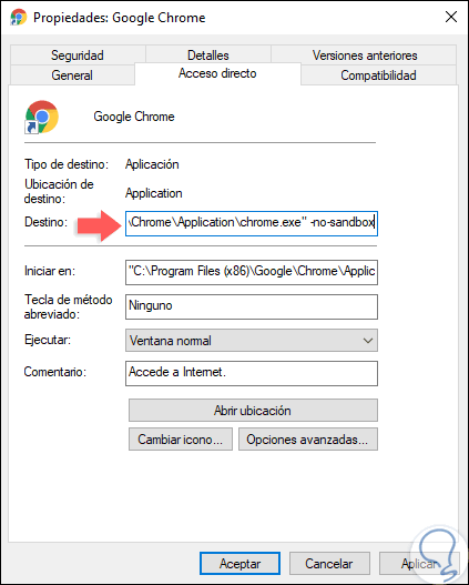 Para ejecutar Google Chrome con el parámetro “-no-sandbox” daremos clic derecho sobre el acceso directo de Chrome y seleccionamos “Propiedades”, allí añadimos la línea “-no-sandbox” al final de la línea en el campo “Destino”. Pulsamos en Aplicar y Aceptar para guardar los cambios.