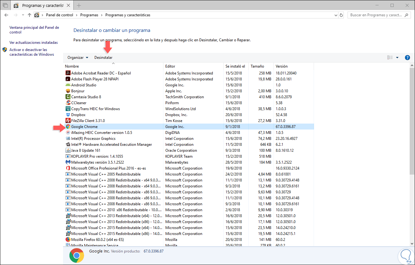 Allí seleccionamos “Google Chrome” y pulsamos en el botón “Desinstalar”: