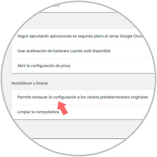 En la ventana desplegada vamos a la sección “Restablecer y limpiar” y allí damos clic en la opción “Permite restaurar la configuración a los valores predeterminados originales”: