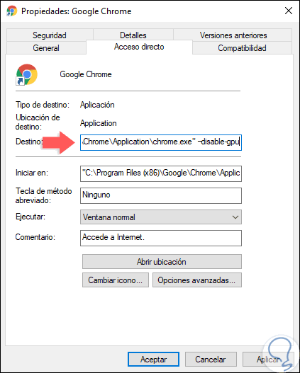 La segunda opción disponibles es dar clic derecho sobre el acceso directo de Google Chrome y allí seleccionar la opción “Propiedades”, luego, en el campo “Destino” añadir la línea “–disable-gpu” al final del texto. Pulsamos en Aplicar y Aceptar para guardar los cambios. En ambos casos será necesario reiniciar el navegador para aplicar los cambios.