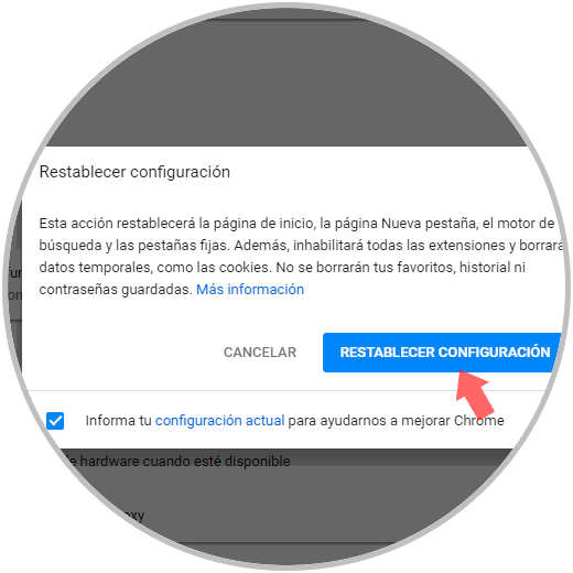 Será desplegado el siguiente mensaje. Pulsamos en el botón “Restablecer configuración” para ejecutar el proceso.