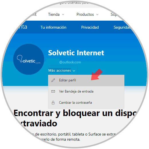 Una vez se inicie sesión pulsamos en la línea “Más acciones” ubicada bajo nuestra foto de perfil y allí seleccionamos la opción “Editar perfil”: