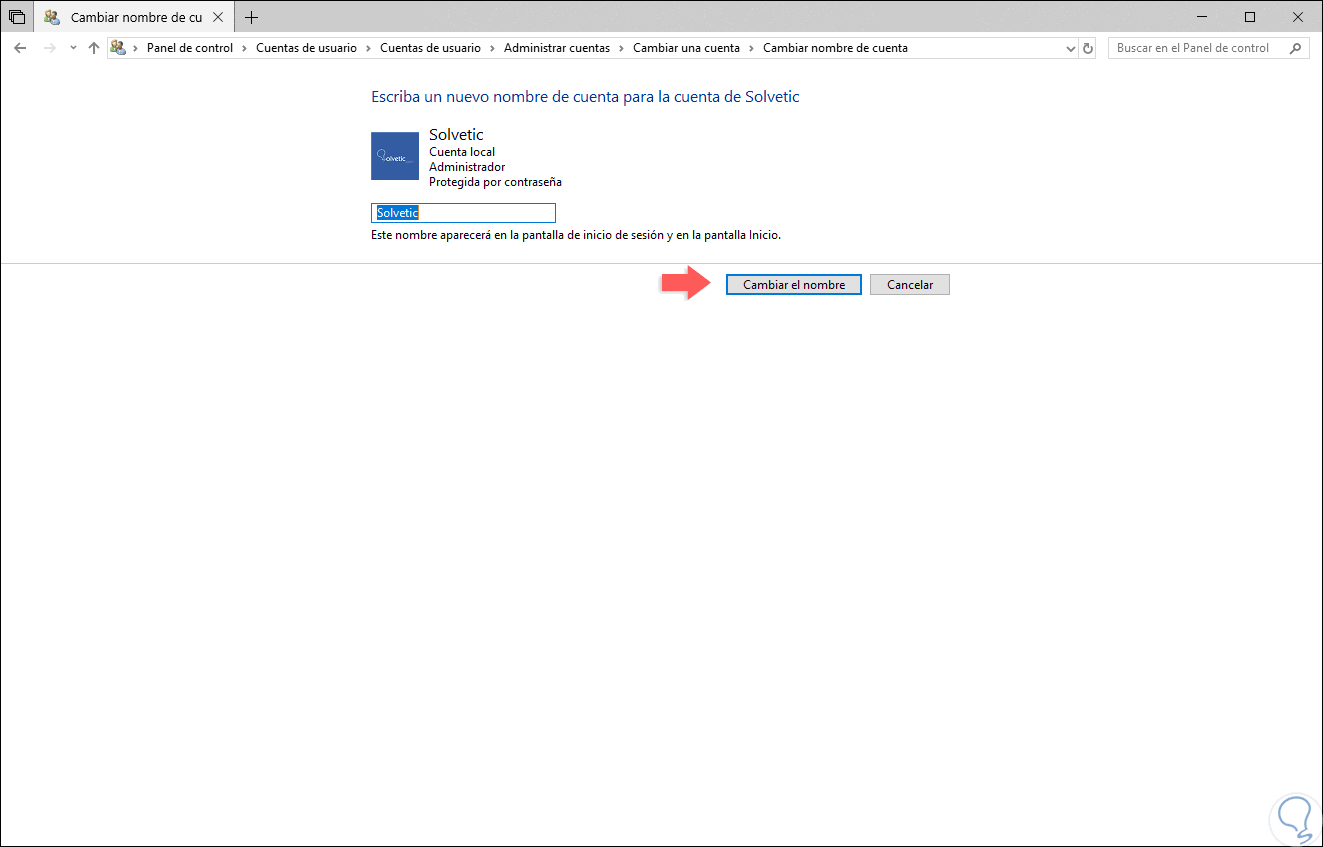 En la nueva ventana ingresaremos el nombre deseado y pulsamos en el botón “Cambiar el nombre” para aplicar los cambios: