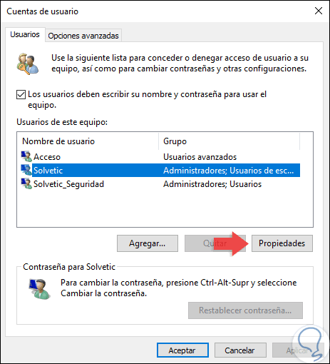 Pulsamos Enter o Aceptar y en la ventana que será desplegada seleccionamos el usuario a editar y damos clic en el botón “Propiedades”: