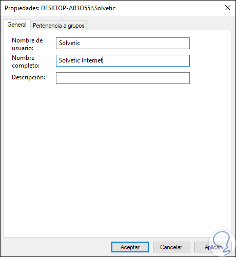 Ahora, ingresamos el nuevo nombre en el campo “Nombre completo”. Pulsamos en Aplicar y Aceptar para guardar los cambios.