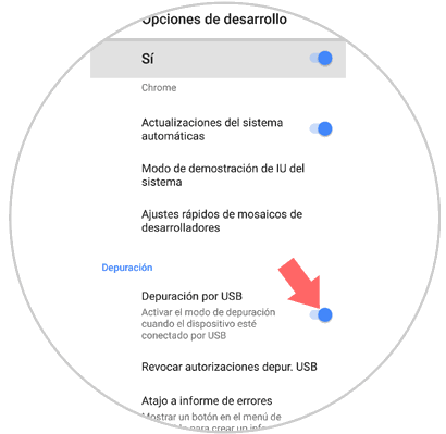 Dentro de las opciones de desarrollo, en la parte superior deberá estar activada “Sí” (viene activada por defecto). Ahora desliza hasta el apartado Depuración. Dentro de esta pestaña encontrarás la opción “Depuración USB”. Desliza la pestaña hacia la derecha para activar esta opción y cuando veas la pestaña en azul significará que el modo depuración USB ya está activo en el móvil para conectar al PC y traspasar archivos.