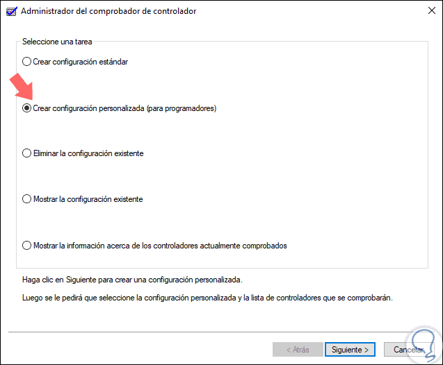 verifierEn la ventana desplegada activamos la casilla "Crear configuración personalizada". Será posible ejecutar Driver Verifier en varios controladores de forma simultánea o en un controlador a la vez. Allí pulsamos en "Siguiente"