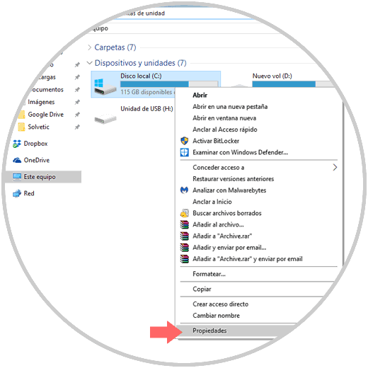 Para comprobar el disco duro, vamos al "Explorador de archivos" y allí damos clic derecho sobre la "Unidad C" y seleccionamos la opción "Propiedades":