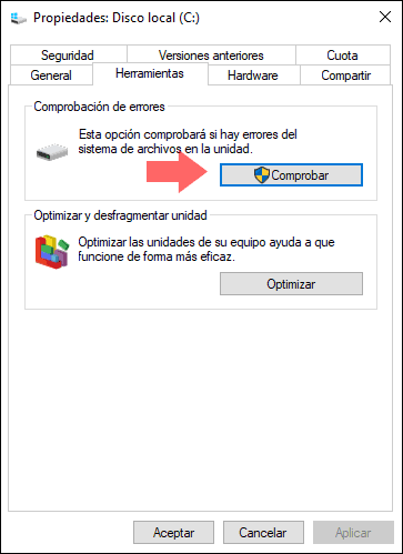 En la ventana desplegada vamos a la sección "Herramientas" y pulsamos en el botón "Comprobar ubicado" en la sección "Comprobación de errores":