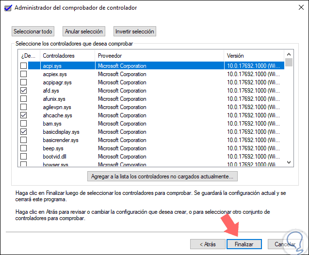 Seleccionaremos los controladores deseados en especial los que no son oficiales de Microsoft. Pulsamos en "Finalizar" para ejecutar el análisis.