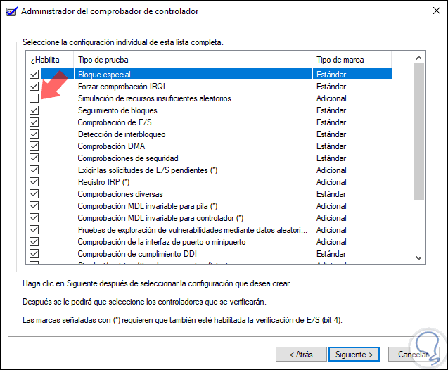 A continuación activamos todas las casillas excepto "Simulación de recursos insuficientes aleatorios". De nuevo pulsamos en "Siguiente"