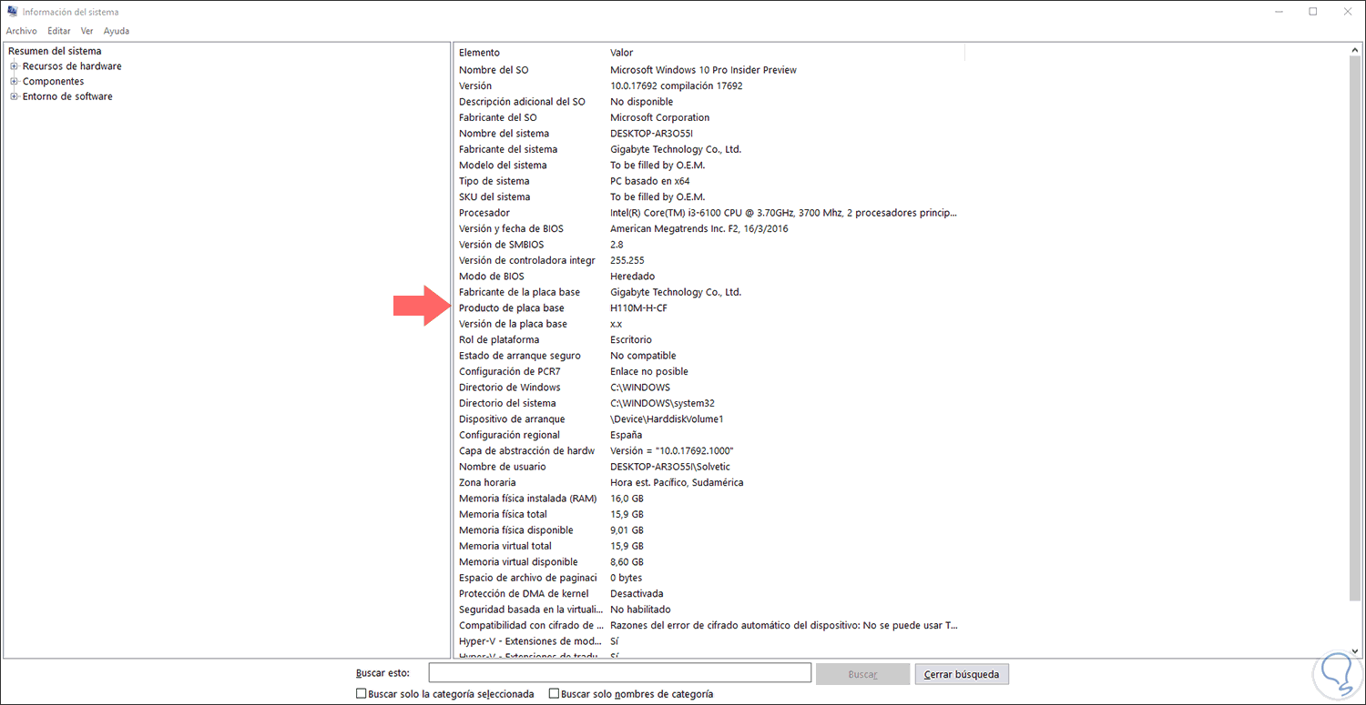 msinfo32Ahora, vamos a la sección "Resumen del sistema" y allí vamos a la línea "Producto de placa base" para conocer el modelo de esta: