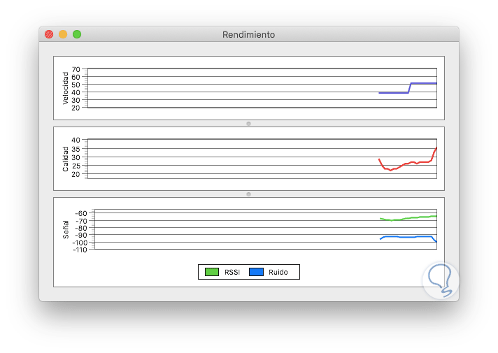 Para obtener acceso a este tipo de gráfico, será necesario ejecutar el proceso de diagnóstico inalámbrico según el paso arriba mencionado, y una vez se haya creado el reporte vamos al menú "Ventana" y allí elegimos la opción "Rendimiento" o bien podemos usar las teclas [color=rgb(51,51,51)]⌥[/color] + [color=rgb(51,51,51)]⌘[/color]+ 5:
